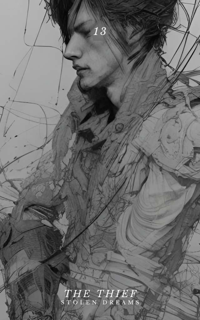 The Thief steals dreams; he is the unstable potential that keeps us up at night. Wonderfully charismatic, charming, and attractive, he holds attentive focus from a captive audience. His pockets are filled with hearts he collects in search of his own. He acts as a mirror, providing service to those blinded by their own reflection. The Thief steals light but must inevitably return it as debt begins to overwhelm him.