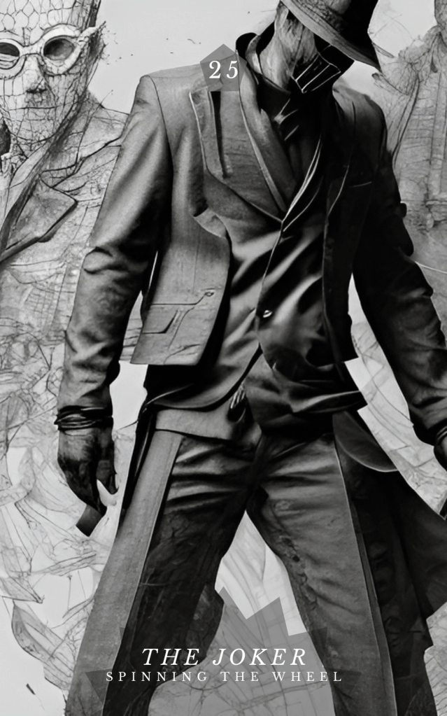 The Joker loves the game, testing his companions to their limit, pushing boundaries and highlighting weakness. He is a formidable adversary who uses humour to disarm. He sees the darkness within the world and likes to play with it. He will not be controlled or coerced, able to laugh at himself; he stands sovereign and will happily spin any wheel. Harsh truth lives in the Joker’s pocket, and he delivers it with a smile on his face.